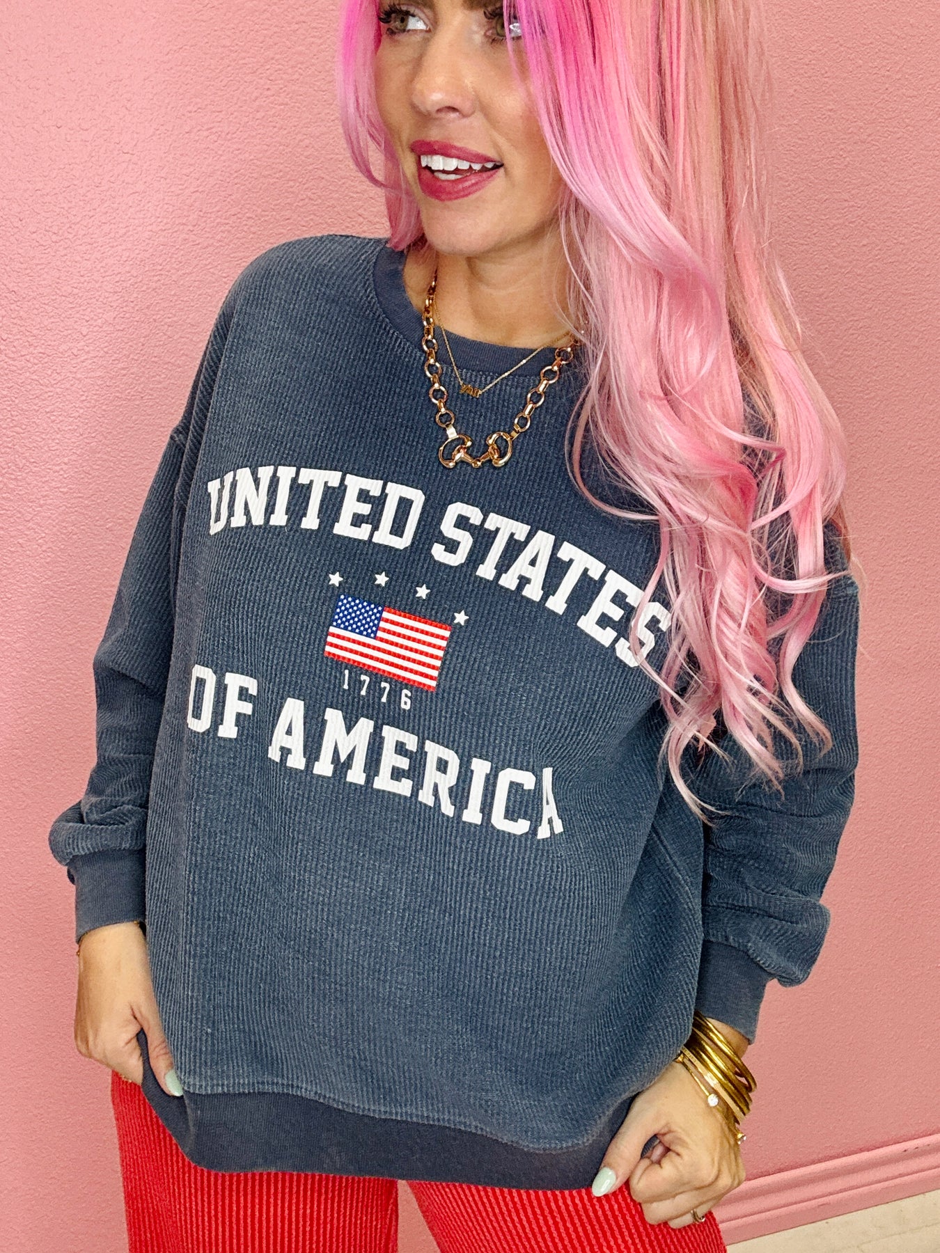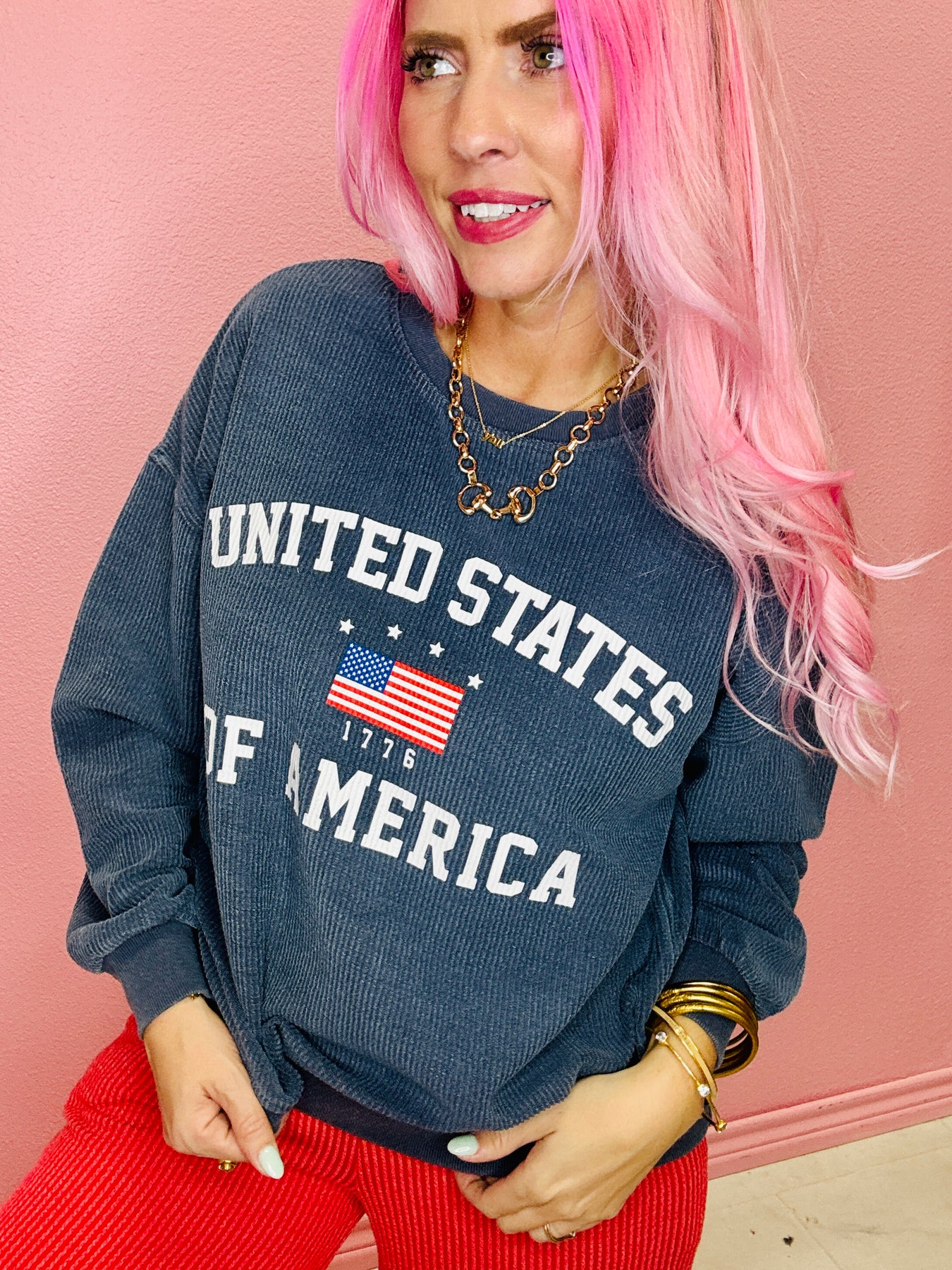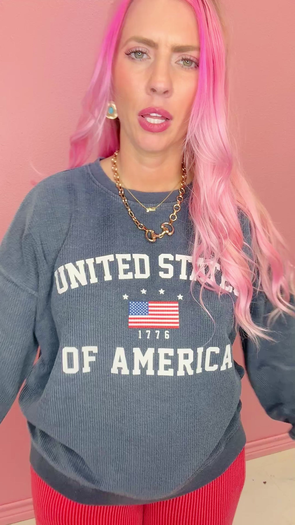 United States of America, 1776 with an American flag! USA navy corded sweater top.