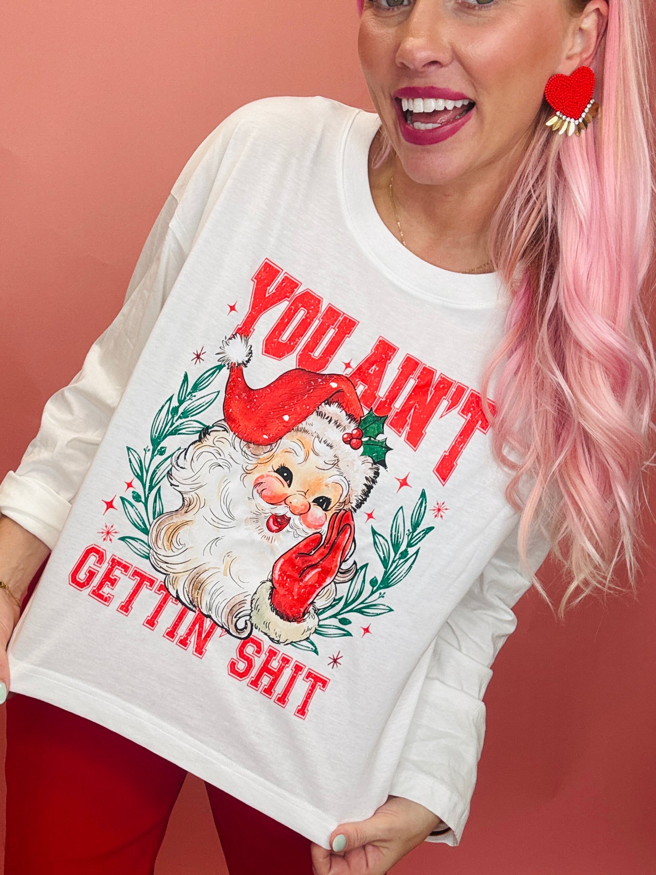 Bring the sass to the season with this cheeky Santa long sleeve that reads, “You Ain’t Getting Shit.” Effortless, chic, and casual, it’s the perfect laid-back holiday look with a touch of humor.