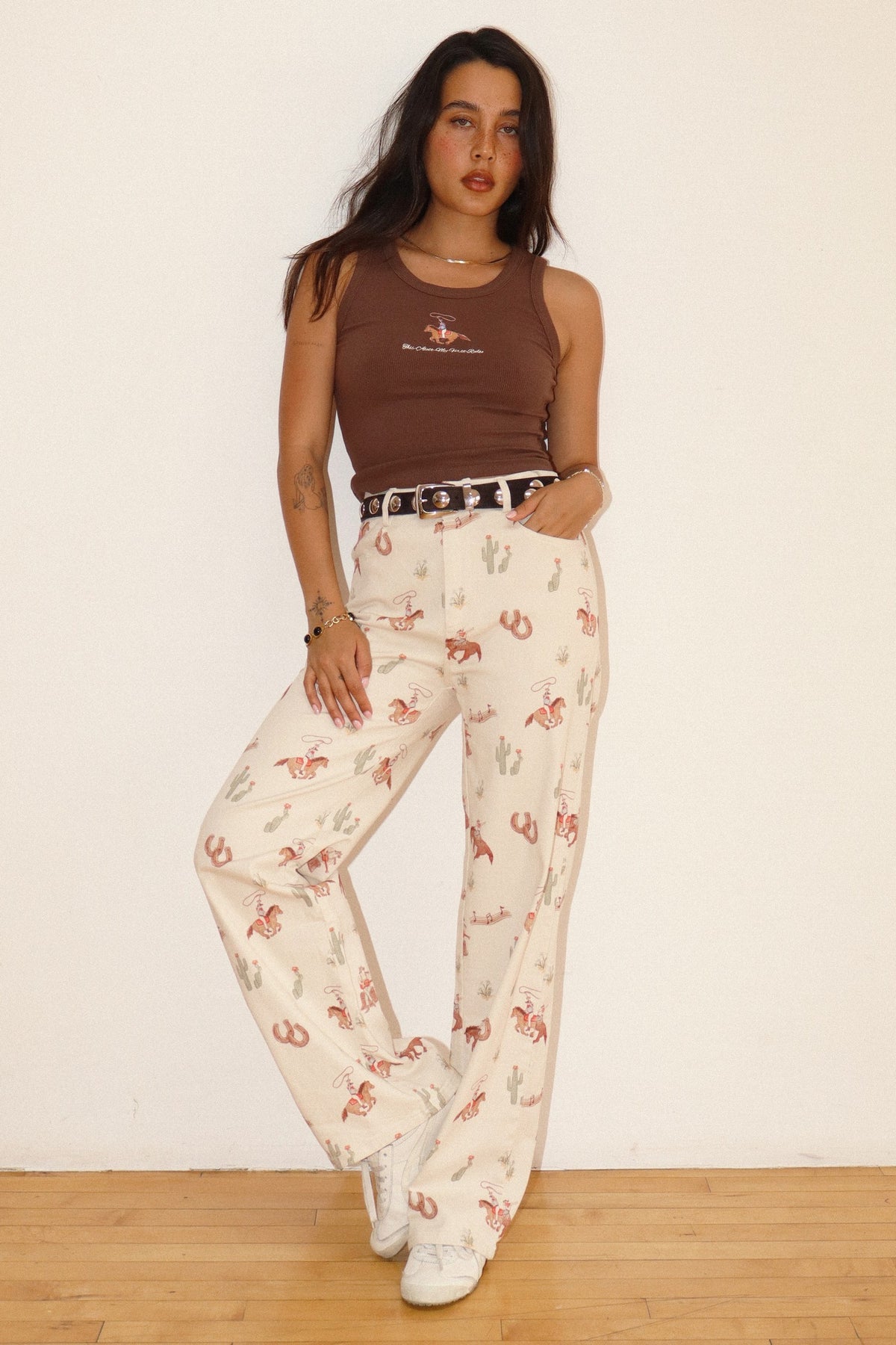 These western-inspired straight leg pants bring rodeo flair to everyday style, blending comfort with a bold cowgirl print. Crafted with a soft stretch finish, they move with you while keeping their shape all day long.