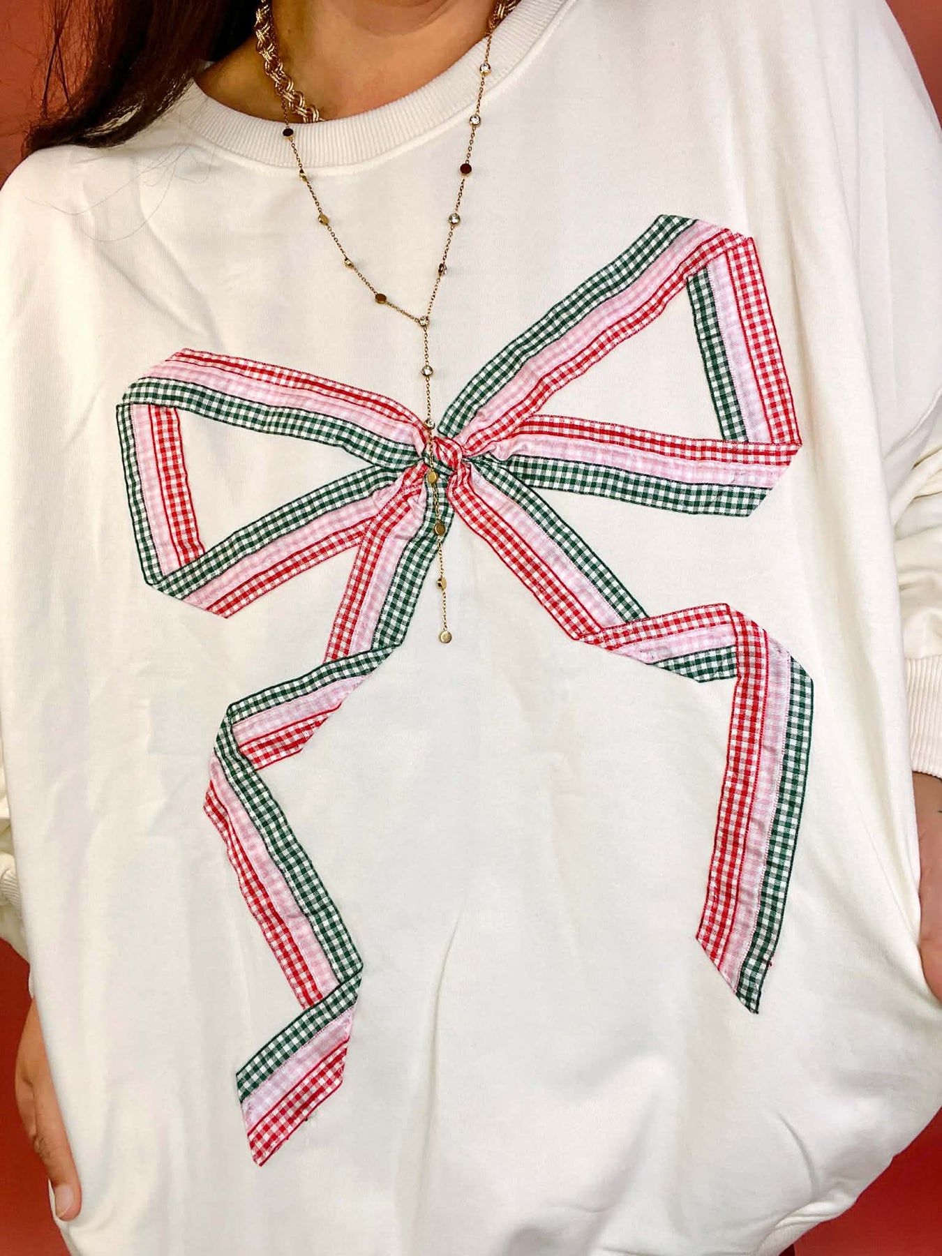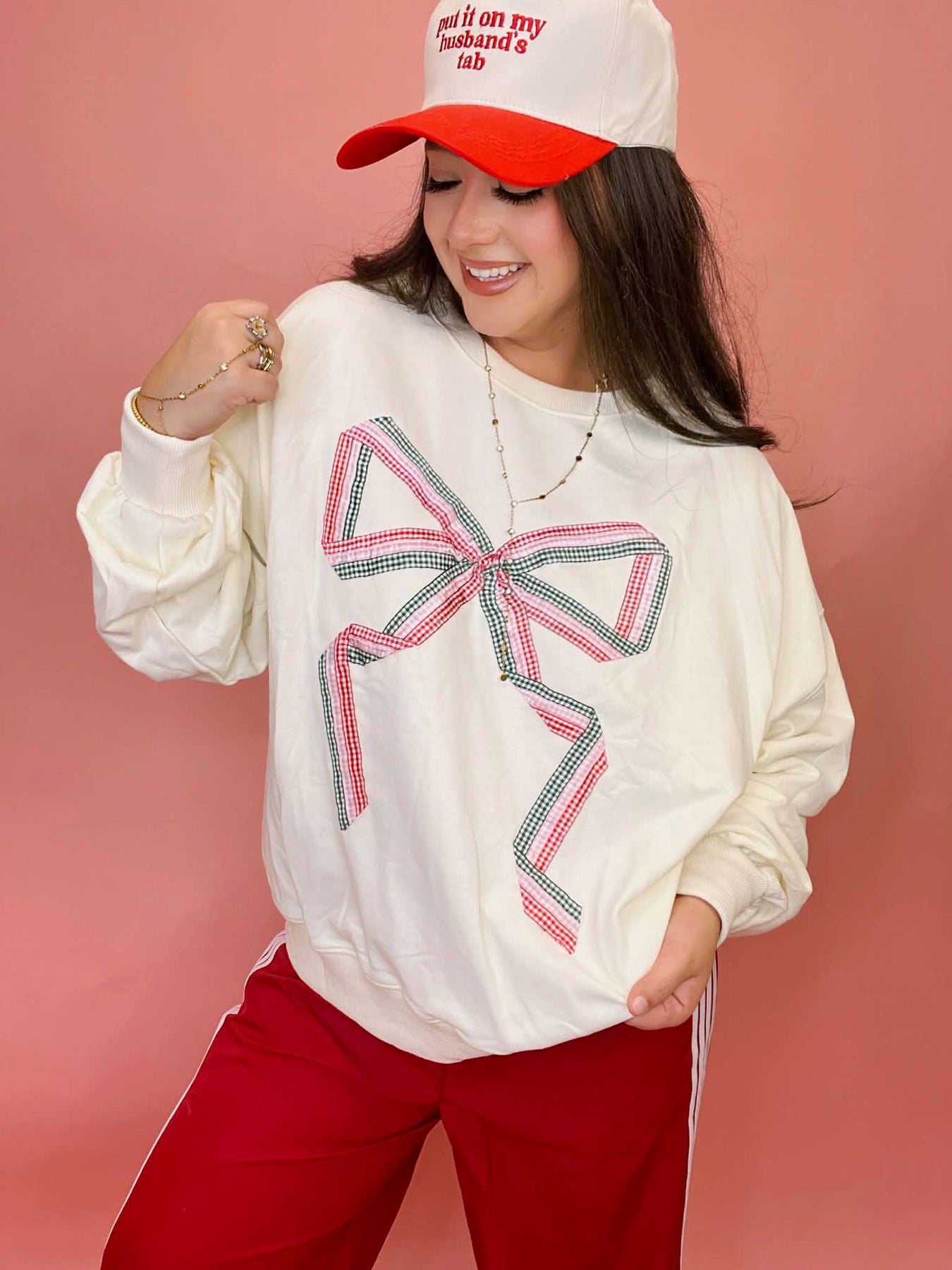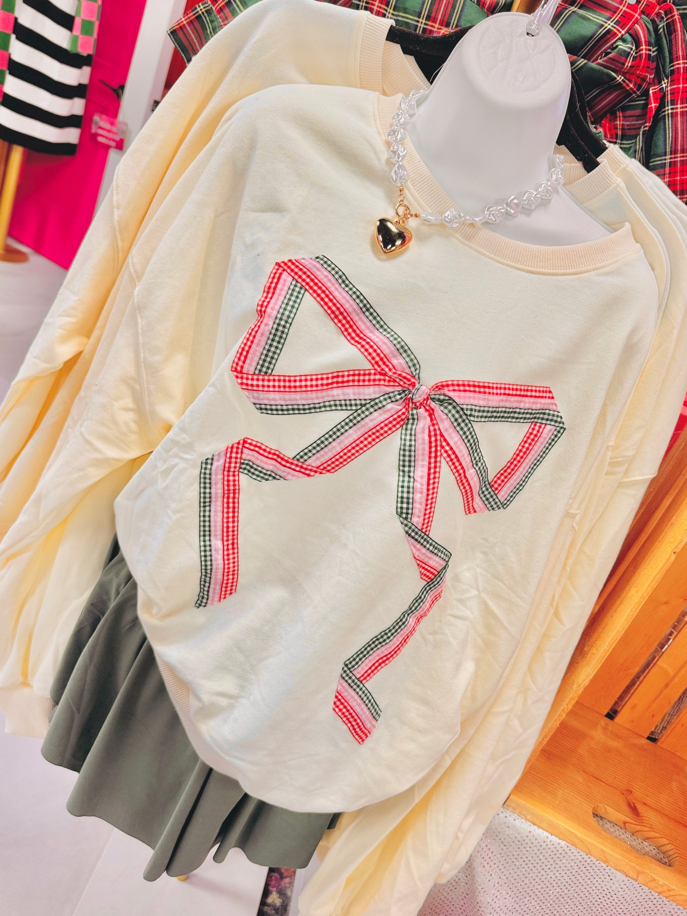 Add a playful pop to your cozy look with this ivory sweatshirt featuring a bold pink gingham bow detail. The relaxed fit makes it the perfect mix of comfy and cute for everyday wear.