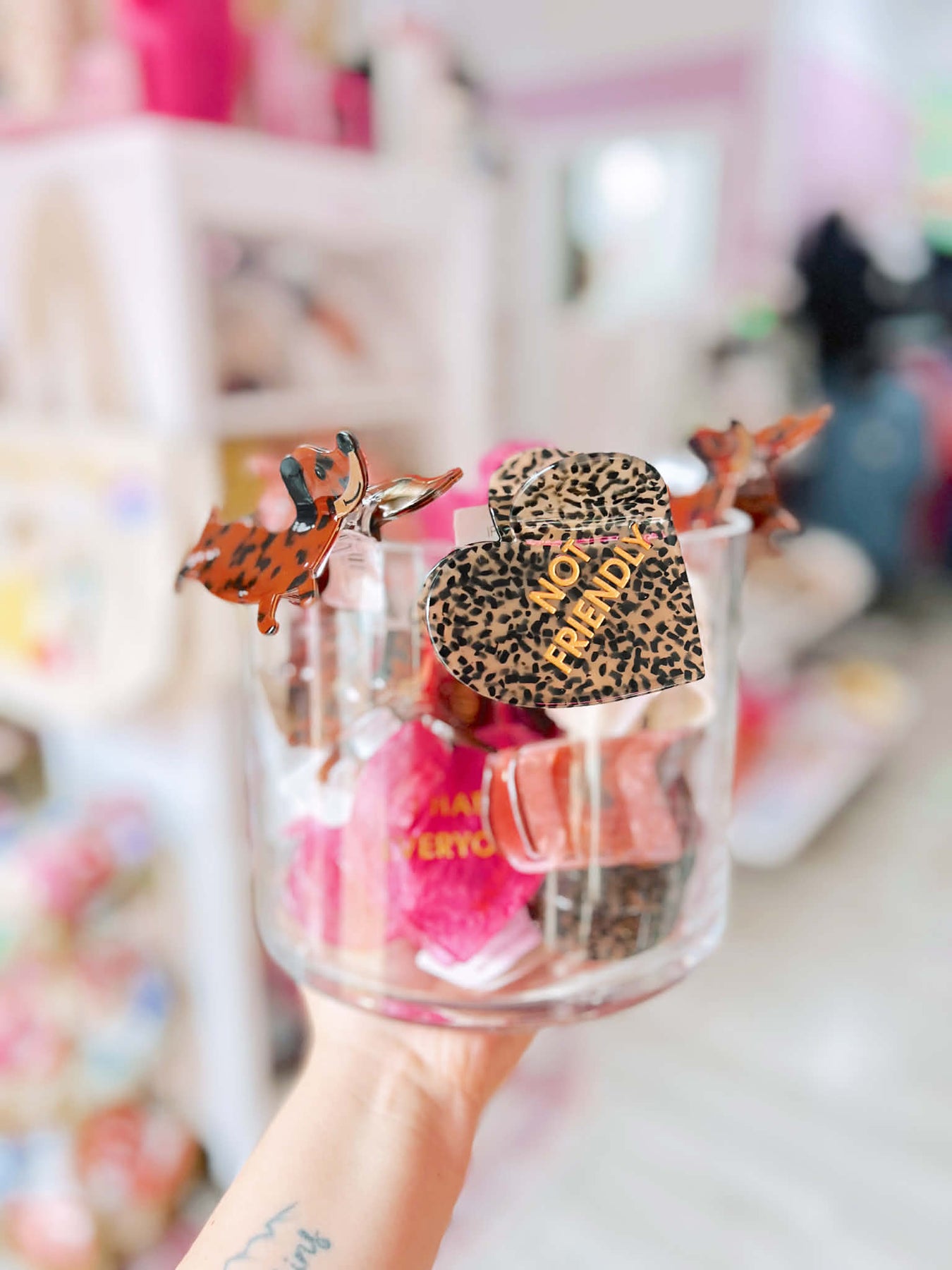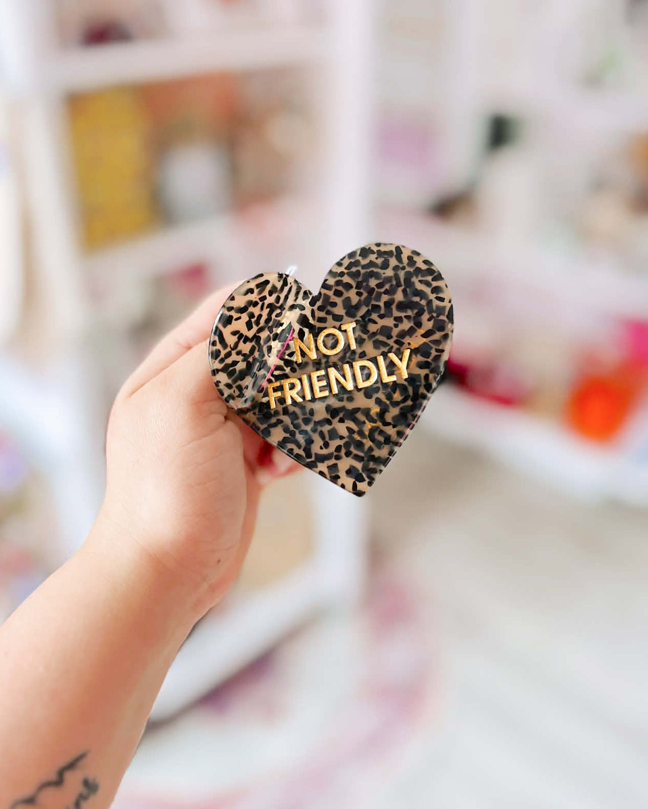 Finally, a hair clip that says what your face already does. Our Not Friendly heart-shaped acetate claw is for the girlies who don’t do small talk, don’t do fake smiles, and definitely don’t do unnecessary human interaction. Wrapped in a chic leopard pattern with bold gold lettering, it’s the perfect accessory for “please don’t” energy.