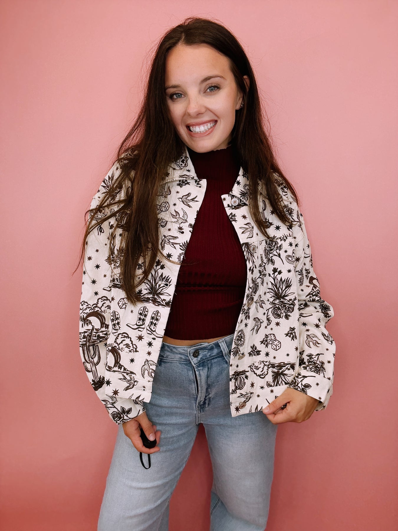 This relaxed-fit cropped denim jacket stands out with its playful mix of prints and laid-back style. Perfect for layering, it adds a bold yet effortless touch to any outfit.
