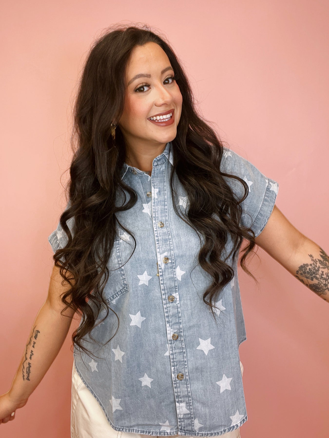 This washed denim button-down is serving laid-back cool with a little starry attitude. It’s the kind of top that feels vintage-inspired but totally now.