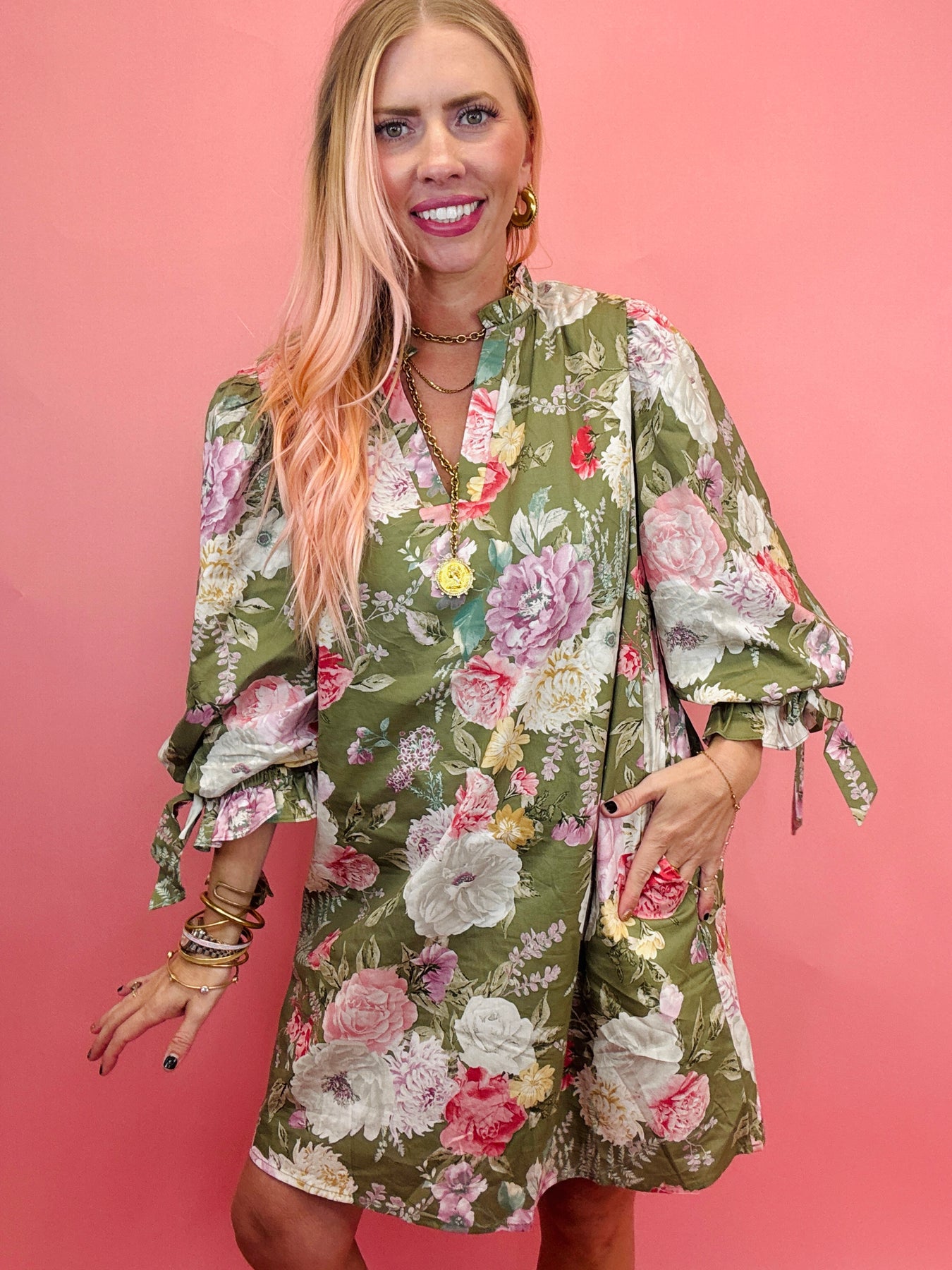 Playful and feminine, this floral print mini dress features ¾ bubble sleeves and a ruffle V-neck finished with a fixed bow accent. Lightweight and lined, it’s a flirty yet functional piece perfect for any occasion.