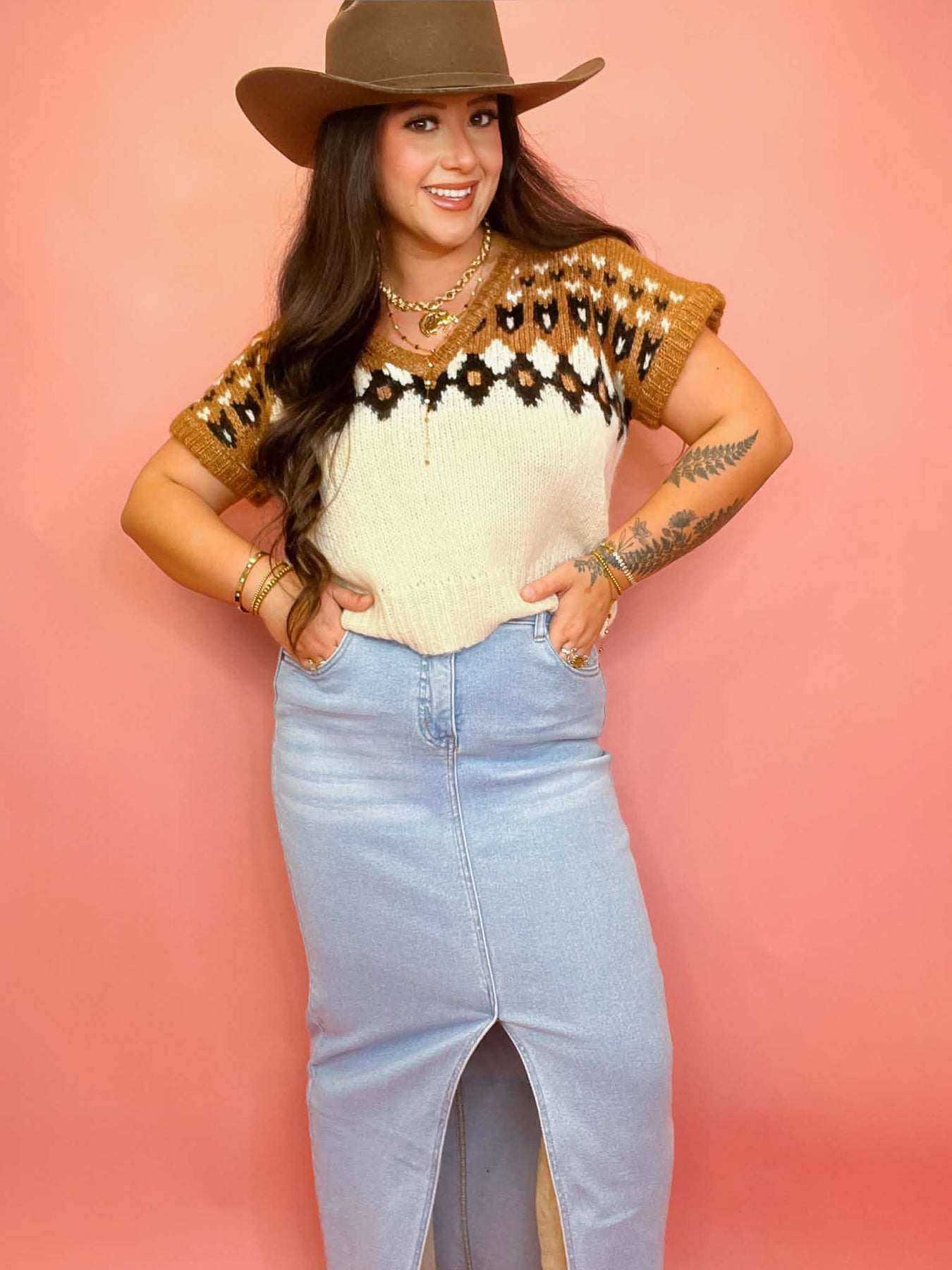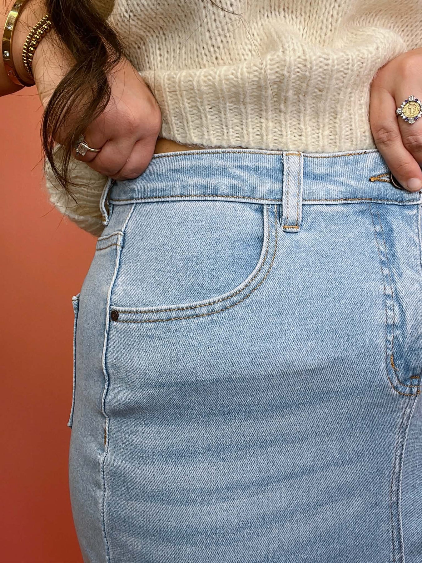 Step into timeless Western elegance with this Light Wash Denim Maxi Skirt, designed for cowgirls who love classic style with a modern twist. Featuring a high-rise fit and a center front slit, this skirt combines vintage rodeo charm with all-day comfort.