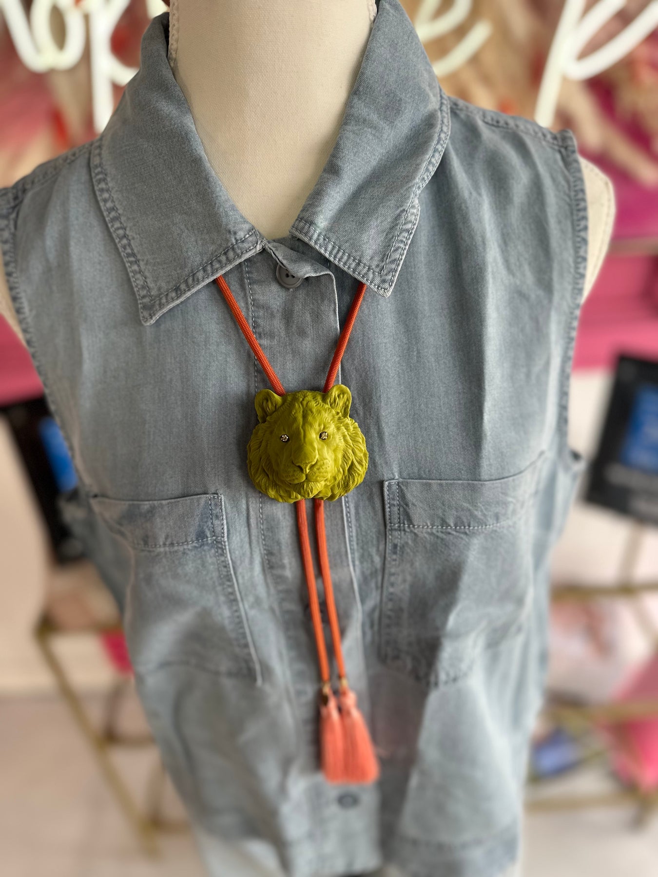 Bring southern flair to any outfit with this standout longhorn bolo. Designed with playful swinging tassels and bold brass hardware, it’s the perfect mix of Western grit and Ole Miss glam.