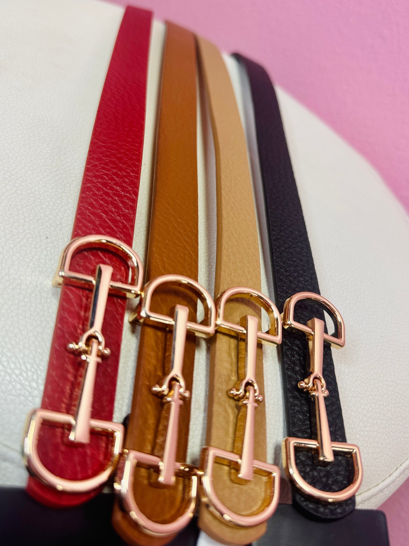 The Equestrian Elegance Skinny Belt features a sleek horse bit buckle, combining delicate design with lasting durability. Its slim 20mm width makes it a versatile accessory for elevating any outfit.