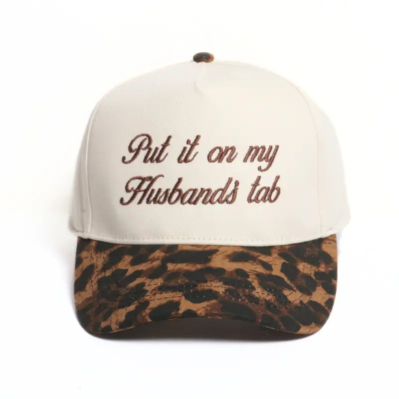 Fun and stylish, this hat features playful ‘Put It On My Husband’s Tab’ embroidery with a chic leopard-print brim — the perfect mix of humor and fashion