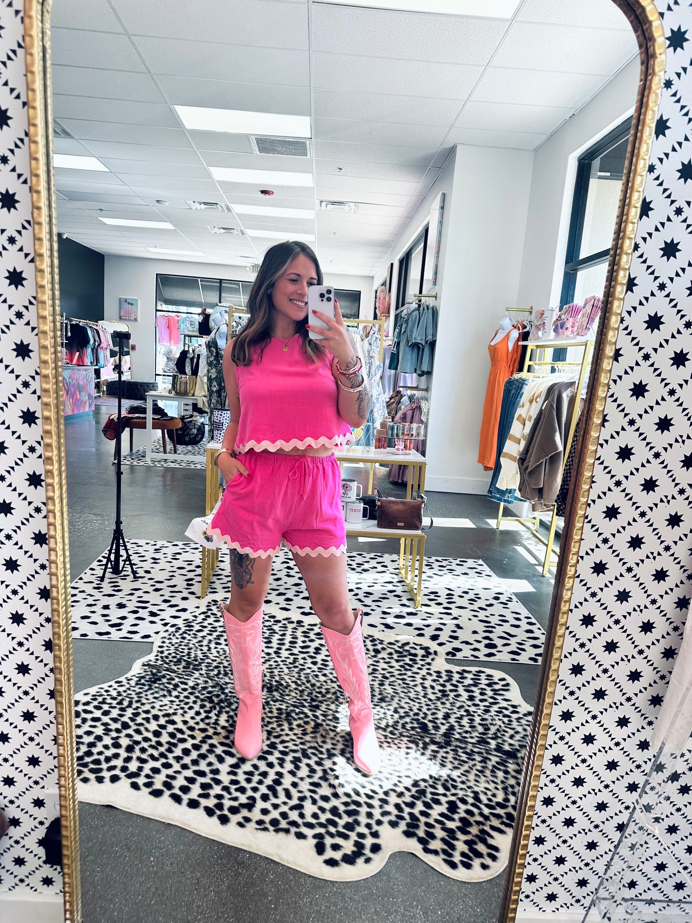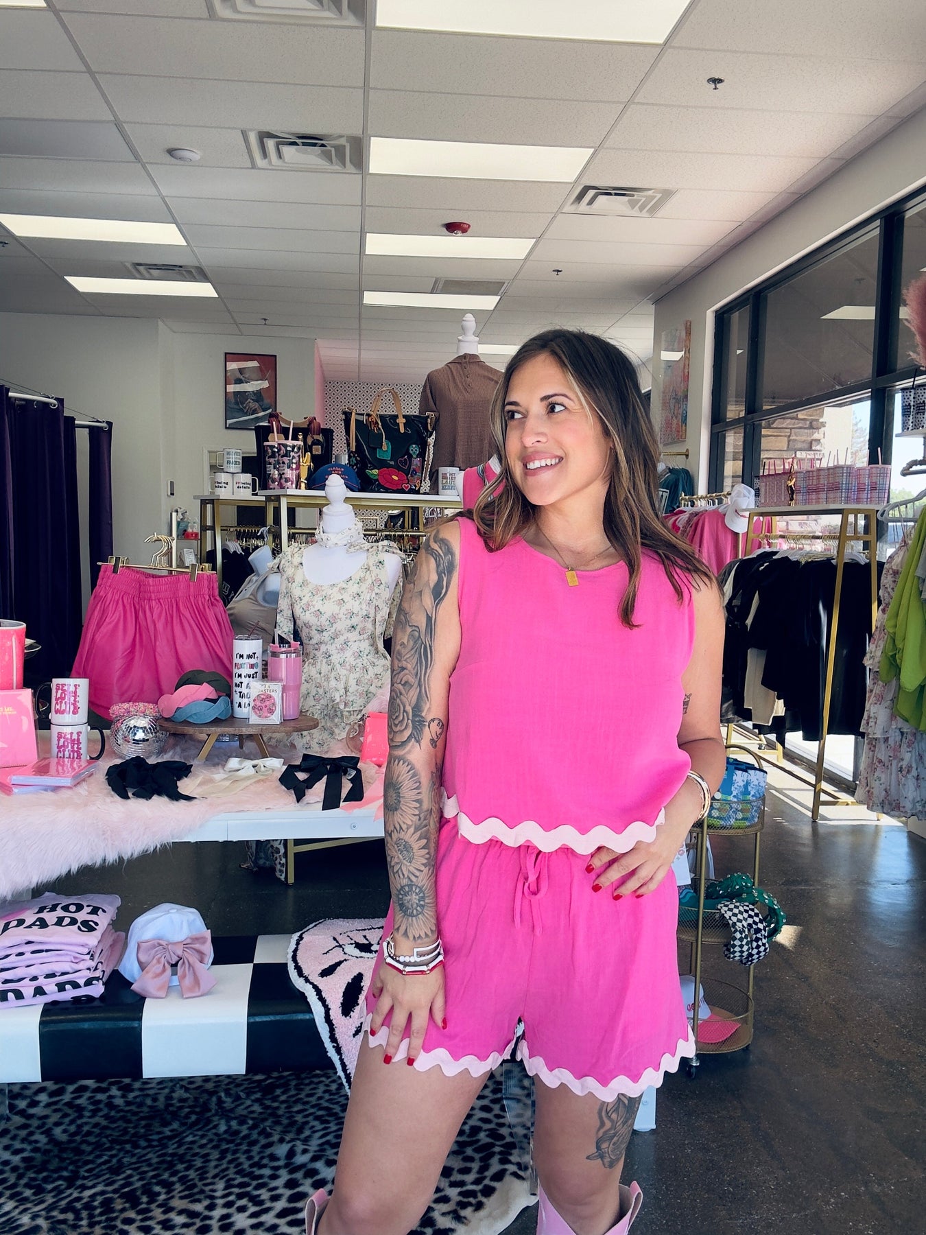 Add a little wave to your wardrobe with this playful two-piece set! Featuring a sleeveless top and high-waisted shorts trimmed with bold ric-rac detail, this look brings effortless charm and fun vibes. Whether you’re lounging, brunching, or beach-bound, this set is your go-to for comfy and cute.