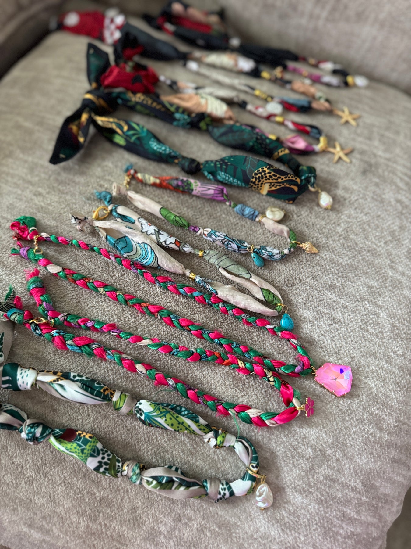 These necklaces are so fun! Each one is a beautiful fabric print adorned with a statement charm. Each necklace is an array of scarfs in multiple prints with an assorted charm.