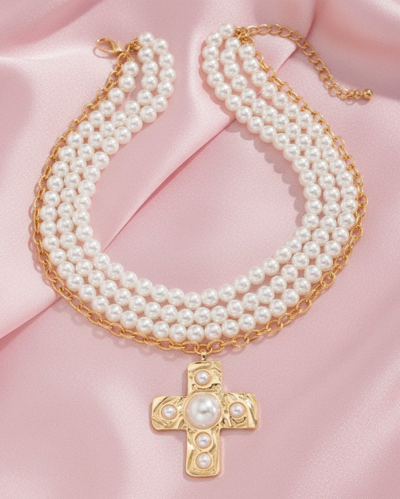 Multi-Wrap Pearl Beaded Cross Charm Necklace is designed to add timeless charm to any look. Featuring pearl beads and a bold pearl heart charm, this piece can be wrapped multiple times for a layered effect or worn long.