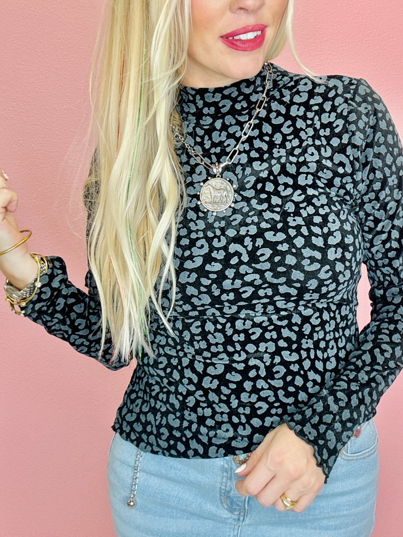 Black Metallic leopard feel! Fitted, but True to size. Ashley is shown wearing her true size, medium here.
