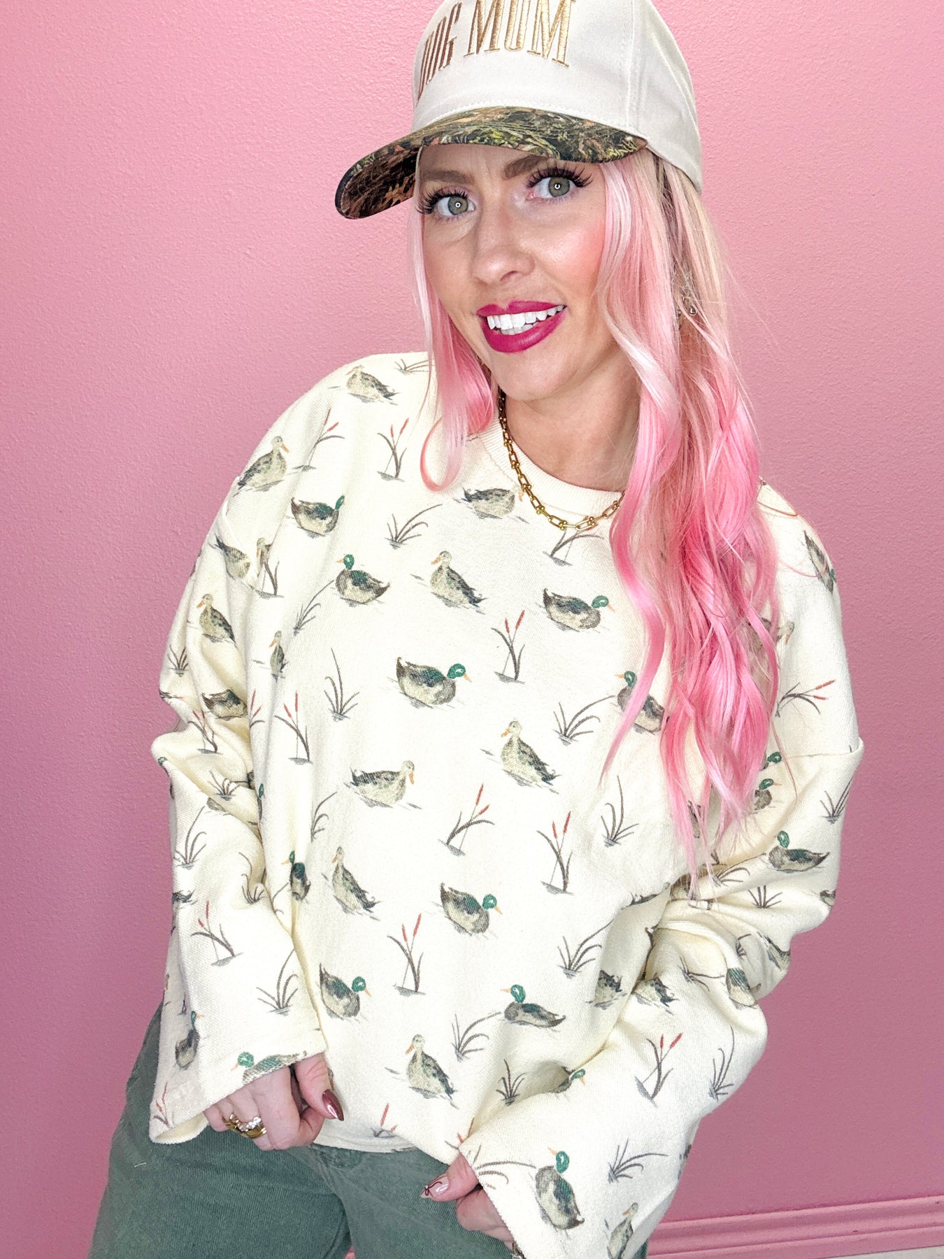 This cream duck print crewneck sweatshirt brings cozy comfort with a touch of countryside charm. Made from a soft cotton blend, it’s the perfect laid-back layer for everyday wear.