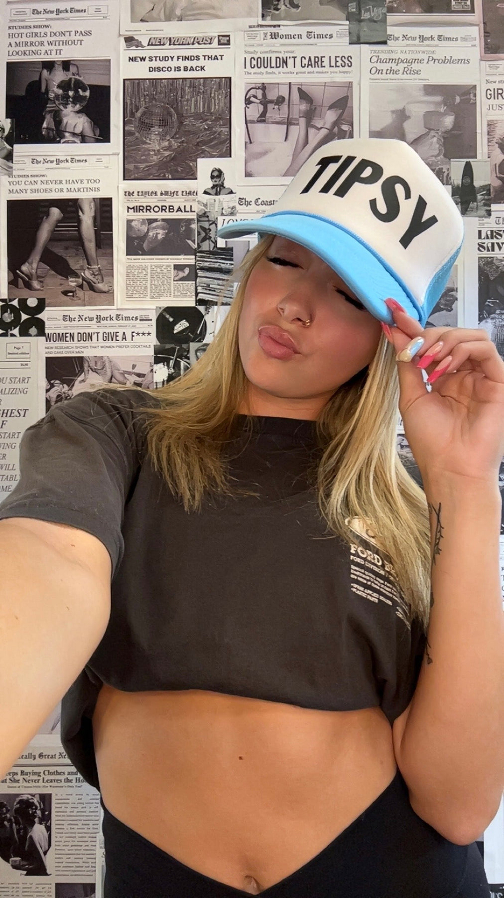 Feelin’ flirty and a little unfiltered? This hat’s your new going-out BFF. Featuring bold “TIPSY” lettering on a crisp white front panel with a baby blue mesh back, it’s made for brunches, beach days, and bad decisions. Lightweight, breathable, and guaranteed to get compliments.