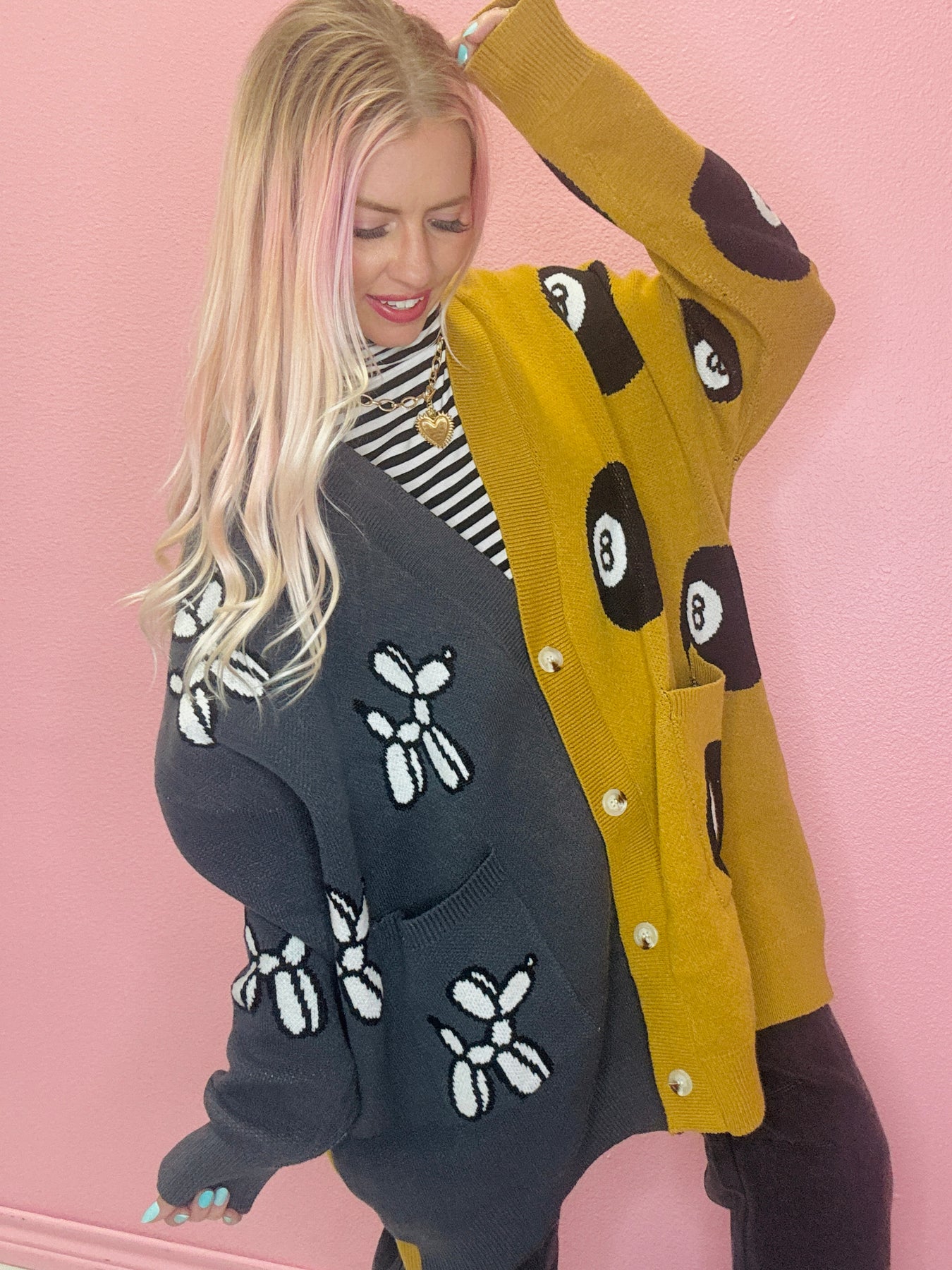 Playful yet elevated, the Balloon Dog & Eight Ball Oversized Cardigan adds a touch of fun to your fall layers. With its soft knit and relaxed silhouette, it’s the perfect statement piece for cozy, effortless style.