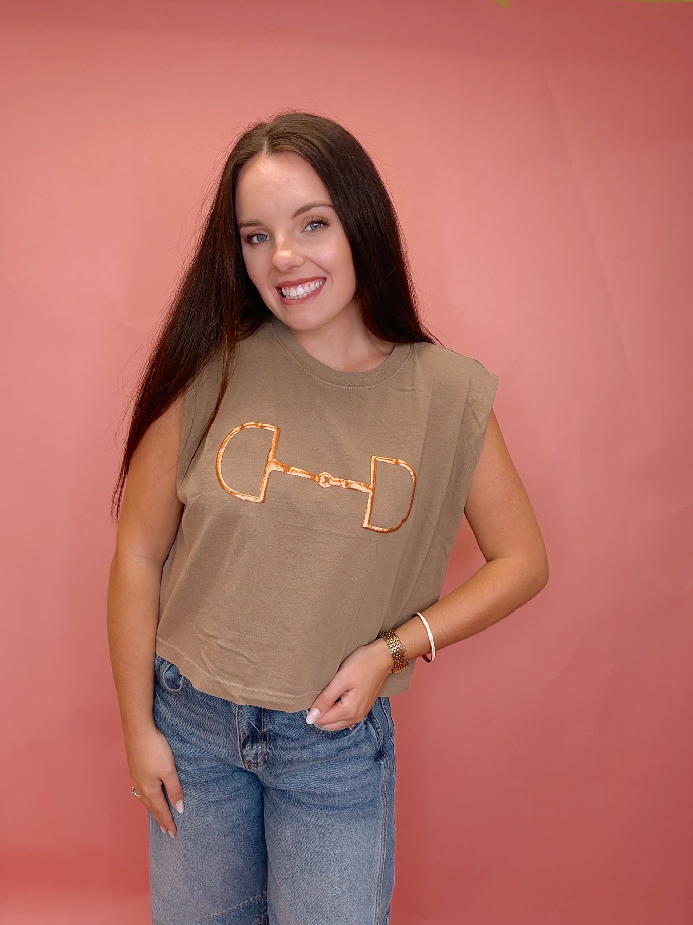 Saddle up your style with this brown muscle graphic tank, featuring a bold western bit design on the front. Its relaxed fit and sleeveless cut make it perfect for layering or wearing solo on warm days.