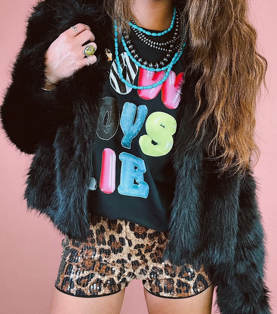 The “Cowboys Lie” Oversized Graphic Tee is a bold statement piece for any modern cowgirl with a sense of humor. Fun, edgy, and totally western, it mixes neon, animal print, and playful bubbles for a look that stands out.