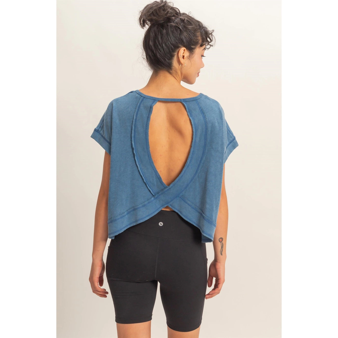This top is crafted from soft acid-washed cotton, providing a faded, vintage texture. It features a classic round neckline and an open back with crossing panels of fabric, including exposed raw-edge seams to enhance its casual appeal. Pair this piece with distressed jeans and sneakers for an effortlessly relaxed and laid-back look.