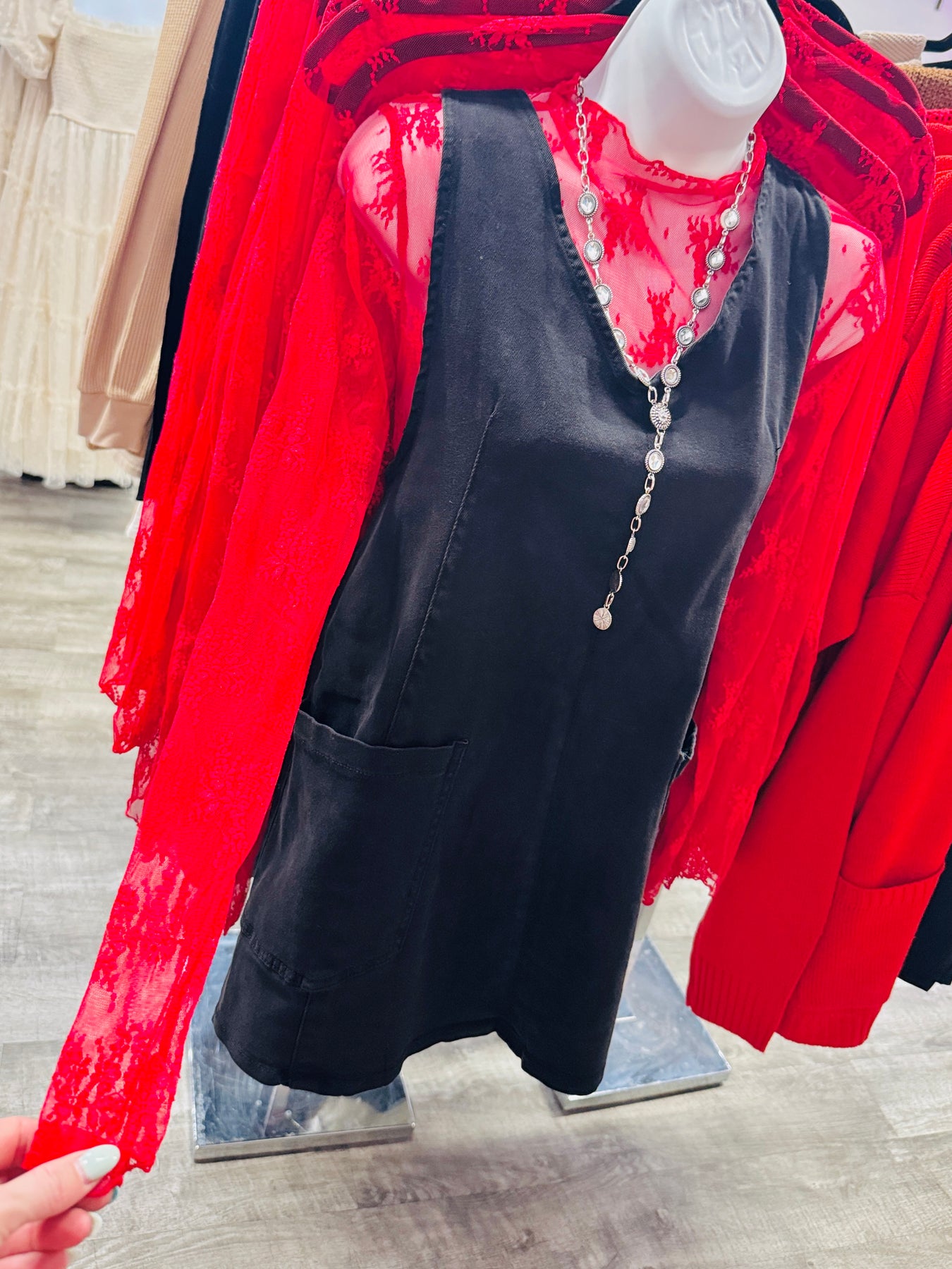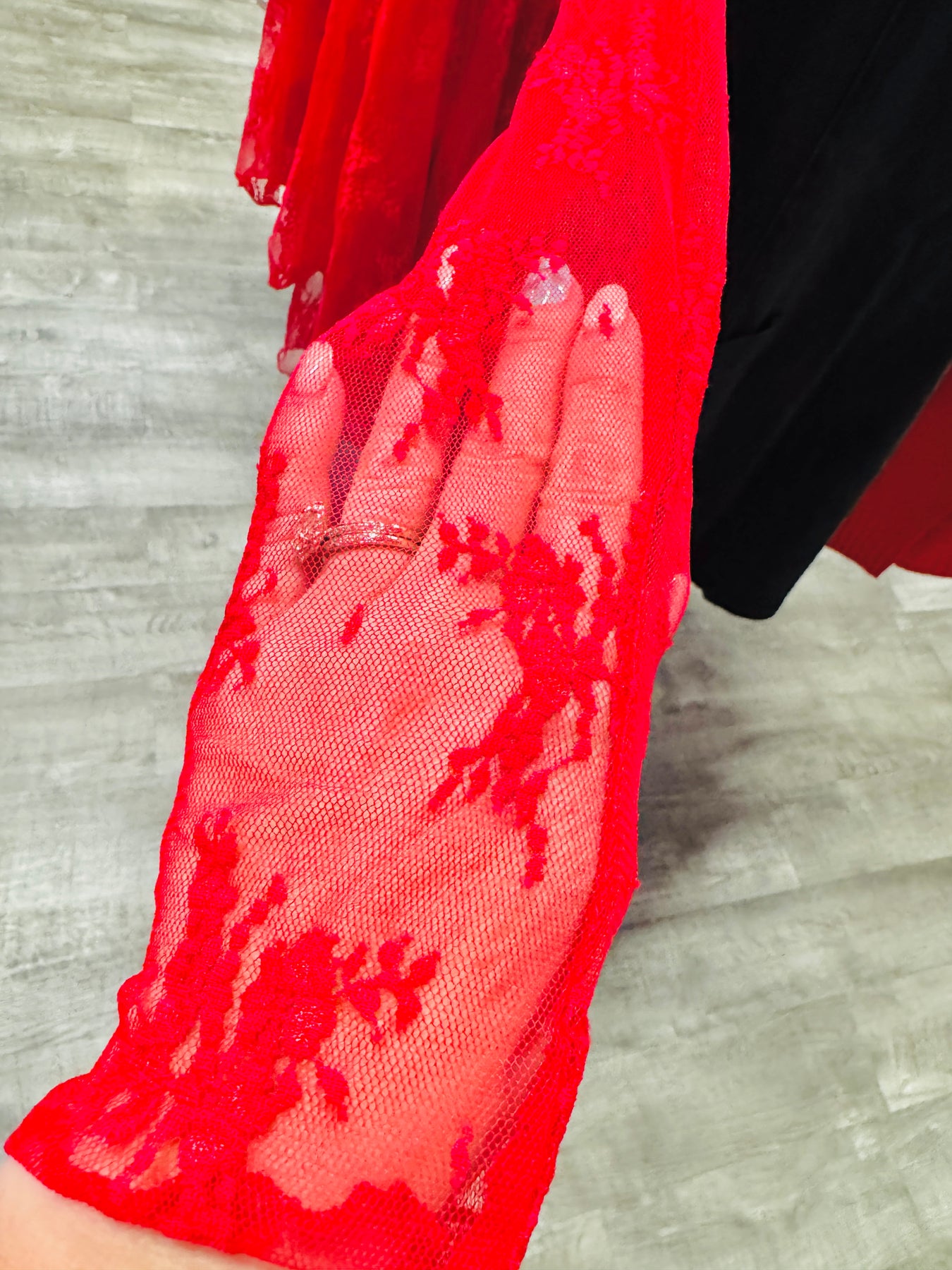A floral lace top with long sleeves and a fitted design, suitable for layering or wearing on its own for a delicate look.