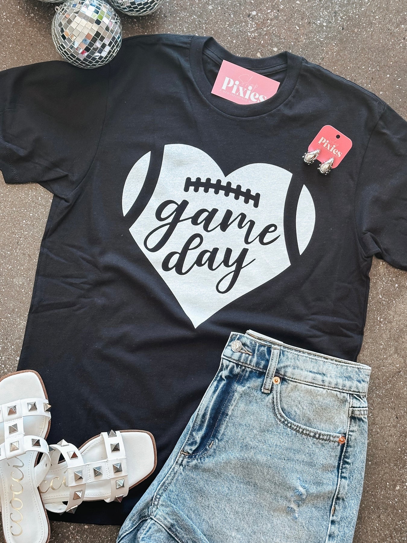 Cheer in style with our Game Day Heart Tee! Featuring a playful football-shaped heart graphic and hand-lettered script, this black tee brings the perfect blend of sporty and cute. Whether you’re tailgating, sitting in the stands, or watching from home, this one keeps you comfy and festive from kickoff to final whistle.