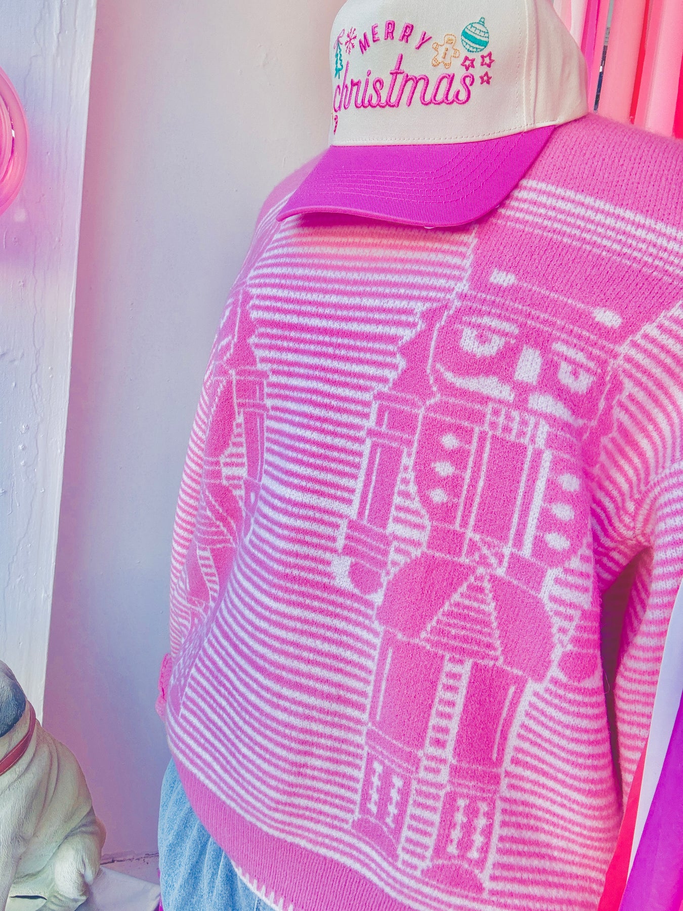 Stay cozy and festive in this playful pink Christmas sweater featuring charming nutcracker details and a standout blanket stitch trim. With its soft knit blend, this piece is as comfortable as it is merry.