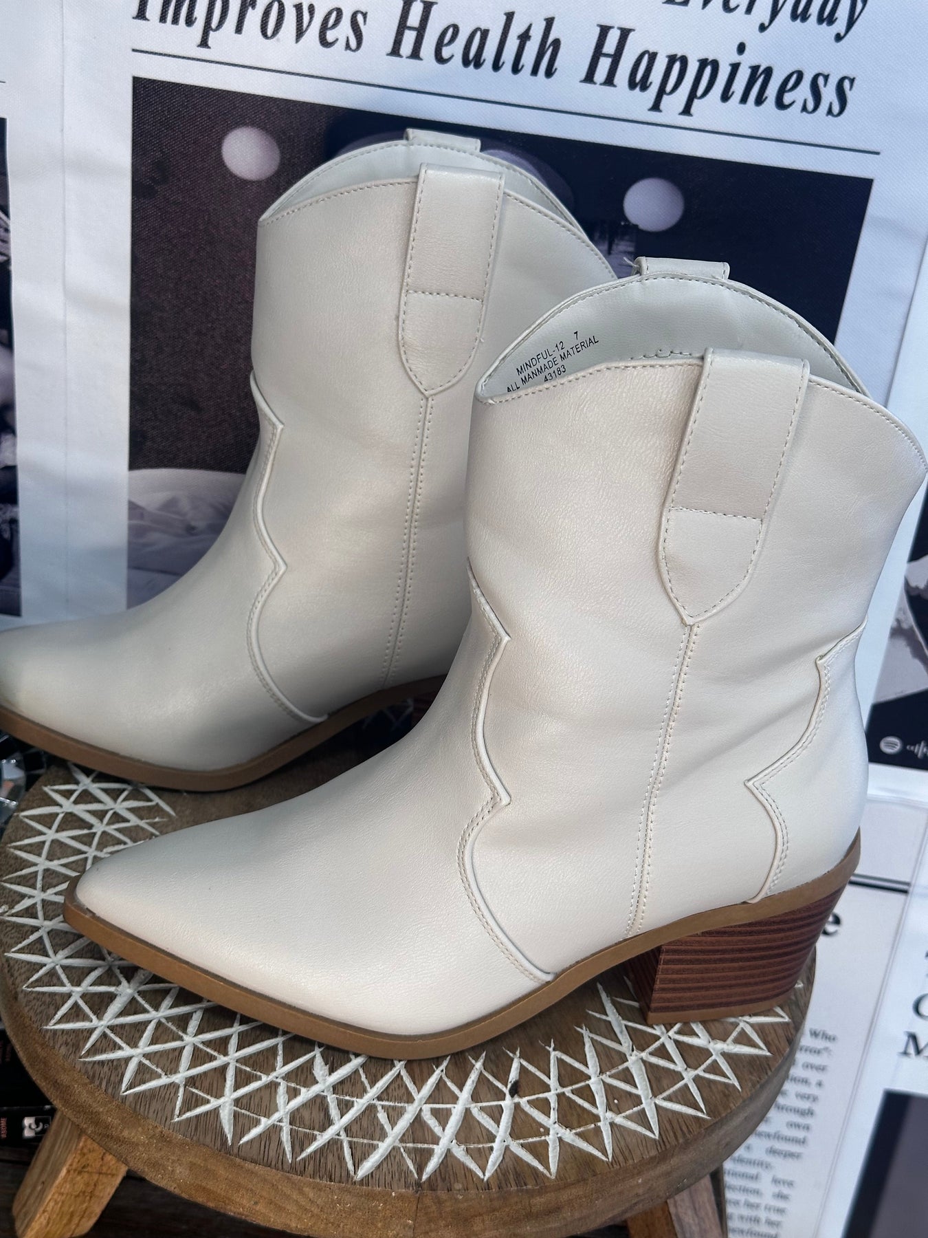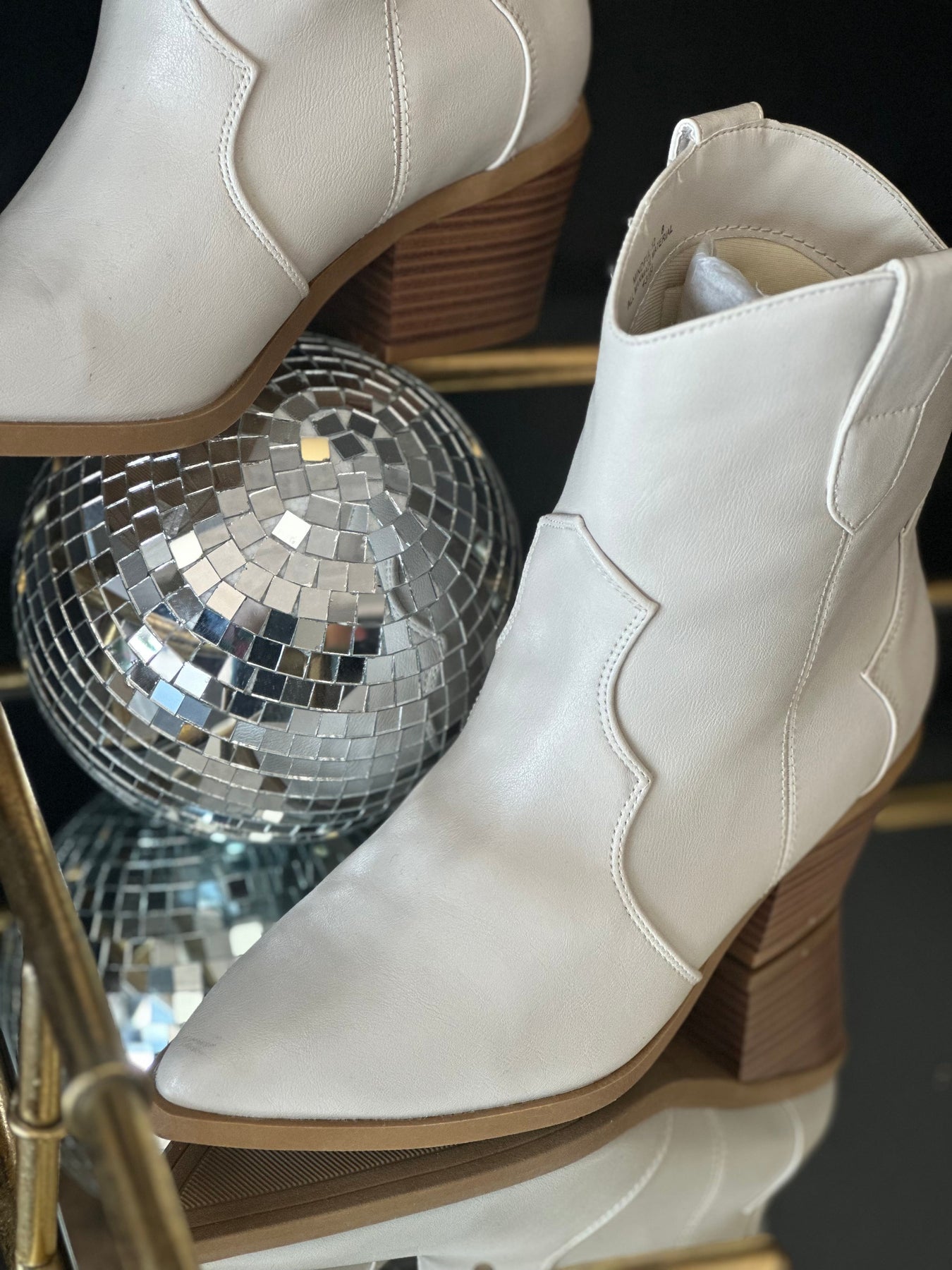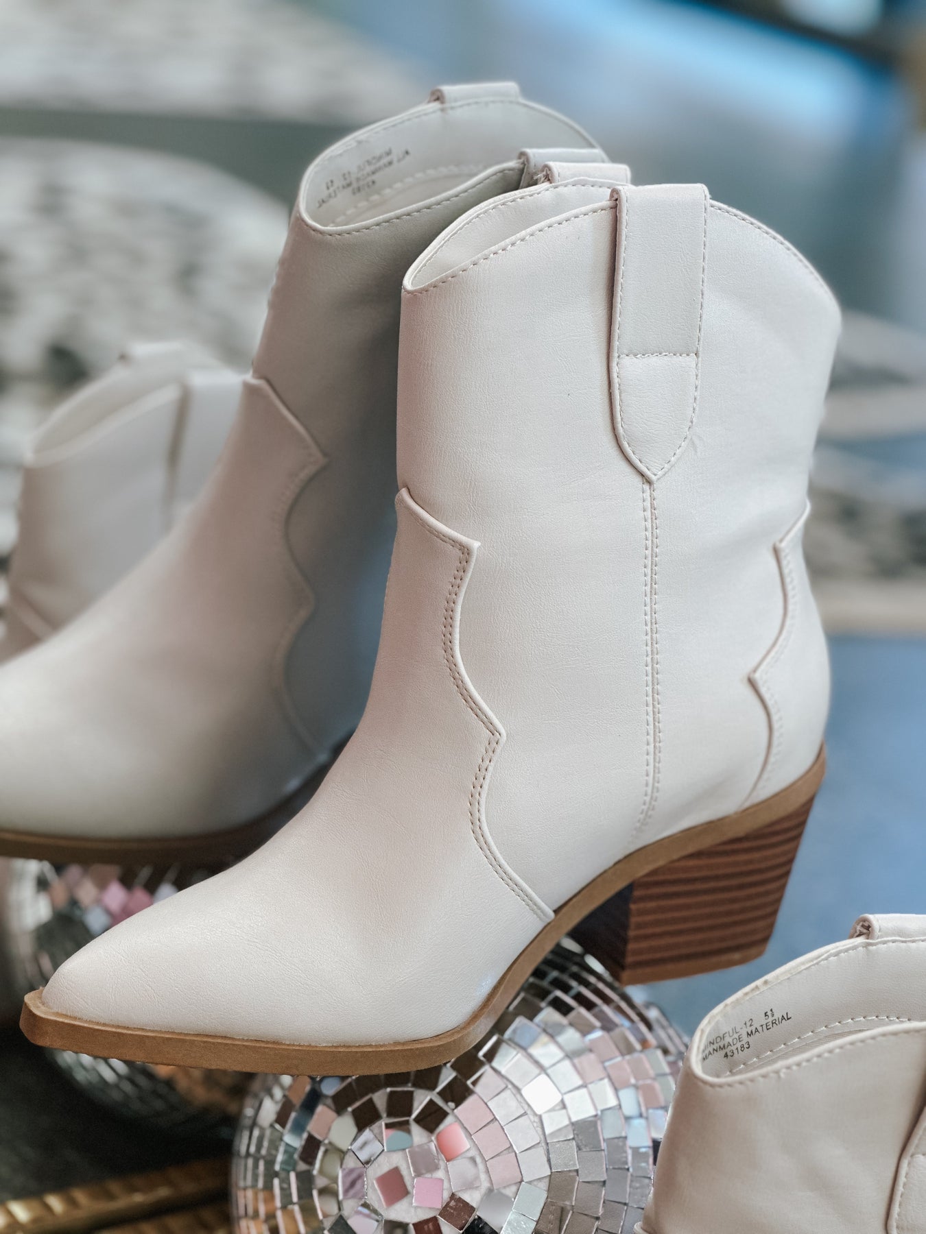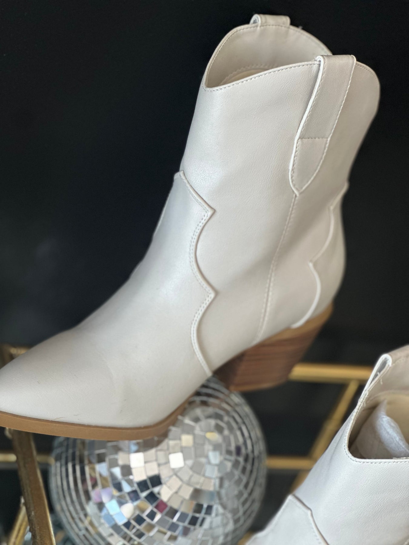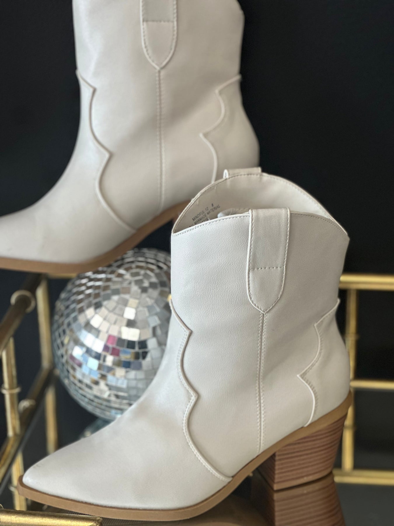 Saddle up, but make it chic. Our Emmy Western Boot brings classic cowgirl vibes with a modern twist. Featuring a sleek white faux leather finish, curved western stitching, and a comfortable stacked heel, these boots are made for making a statement—whether you’re dancing under a disco ball or strolling through town. The pointed toe adds just the right touch of sass, and the pull-on design makes them easy to slip on and go. Style them with denim, dresses, or anything that needs a little country-meets-cool flair.