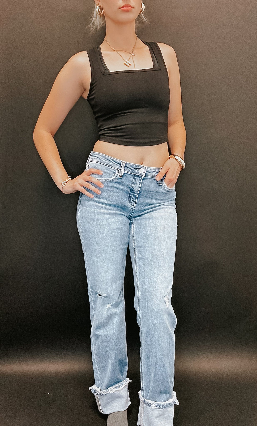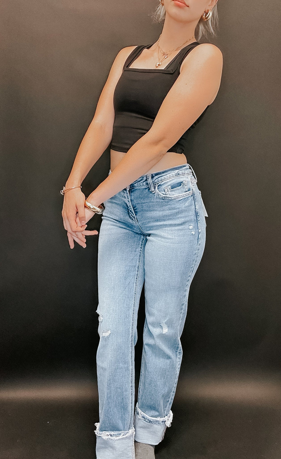 A little rugged, a lot of style. These light-wash jeans feature subtle distressing and oversized raw cuffs that give off major laid-back, cool-girl energy. The high-rise fit hugs in all the right places while keeping it comfy and casual. Pair ’em with graphic tees, boots, or sneakers—these jeans do it all.