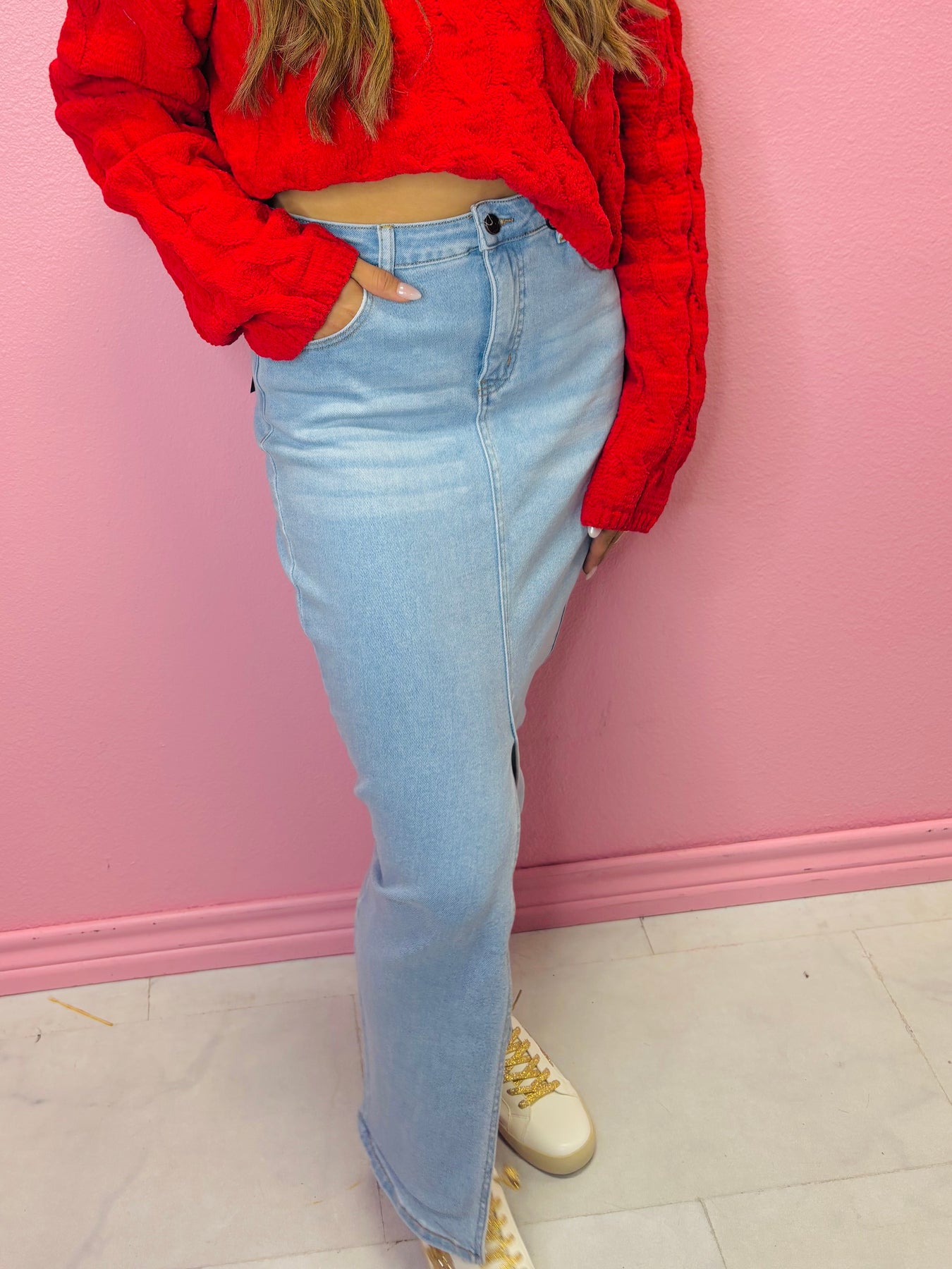 Step into timeless Western elegance with this Light Wash Denim Maxi Skirt, designed for cowgirls who love classic style with a modern twist. Featuring a high-rise fit and a center front slit, this skirt combines vintage rodeo charm with all-day comfort.